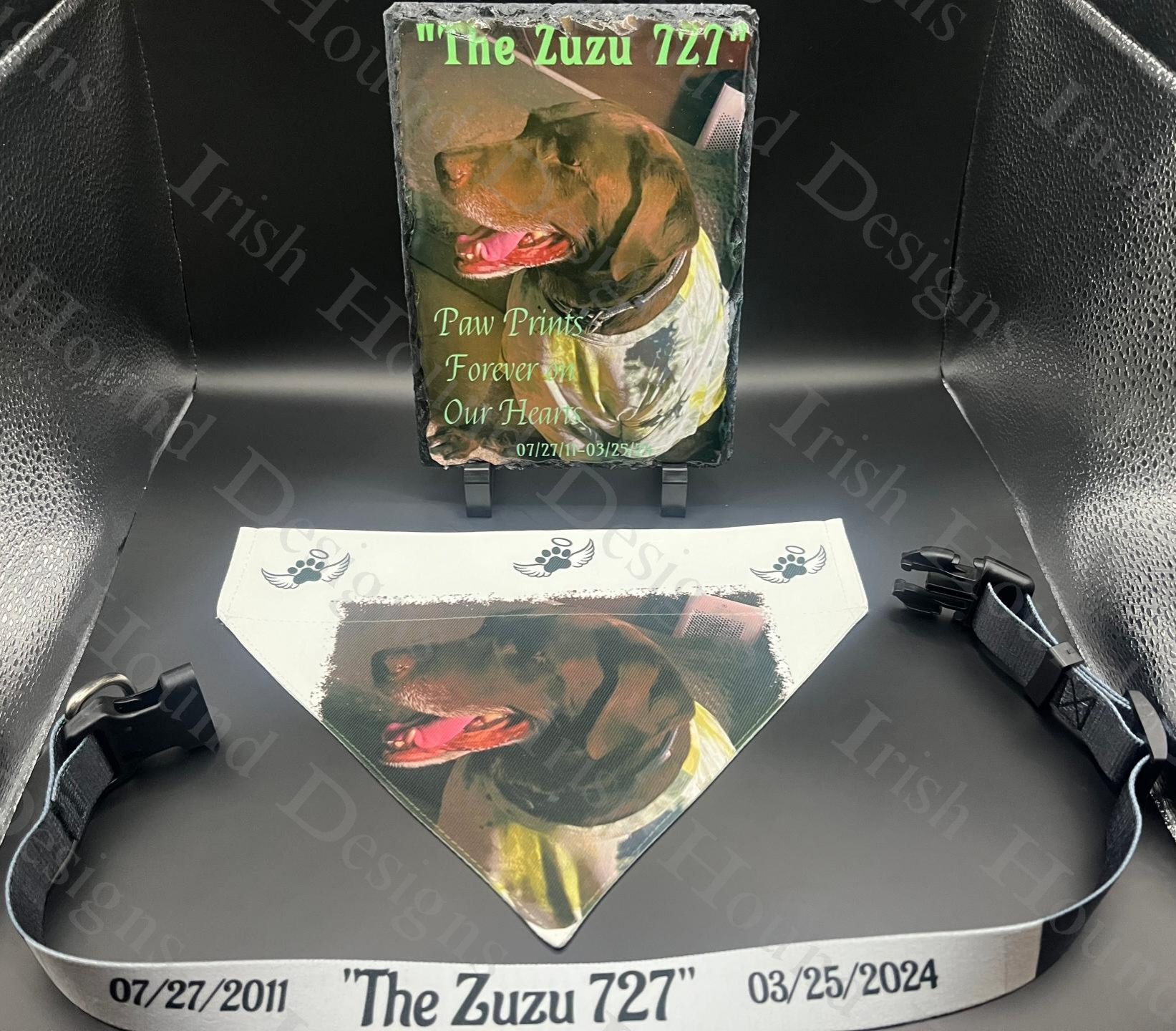 - 1 5x7 slate photo plaque: A stunning display featuring your pet's name, and a heartfelt sentiment, making this a timeless keepsake.