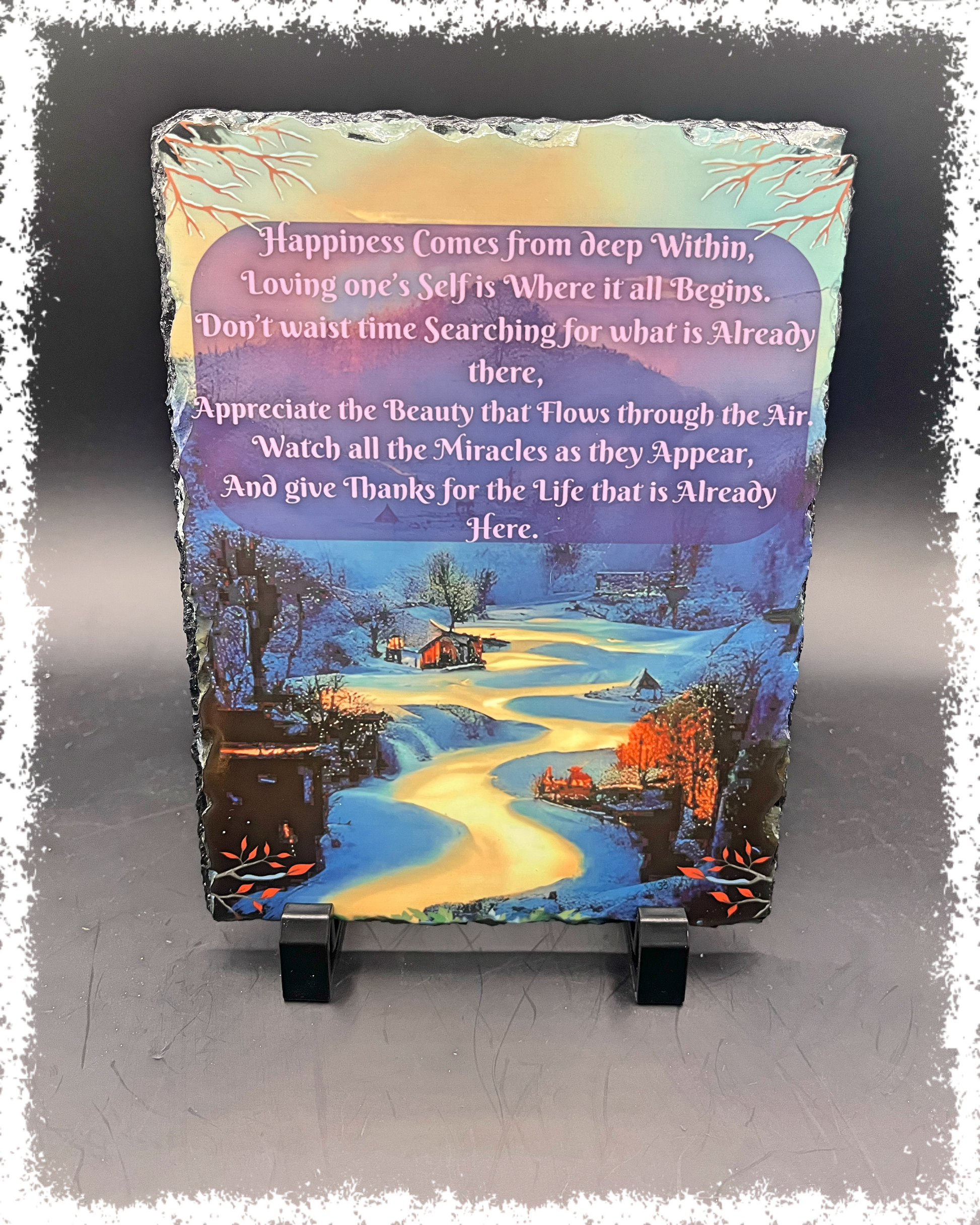Discover the essence of happiness with "The Miracle Within" SoulStone, A breathtaking depiction of a serene, wintery mountain village at sunset offering a sense of peaceful reflection reminding us that life's beauty is often found in the simplest and overlooked moments. The accompanying poem speaks to the transformative power of self-love, gratitude and appreciating the miracles that we witness every day.